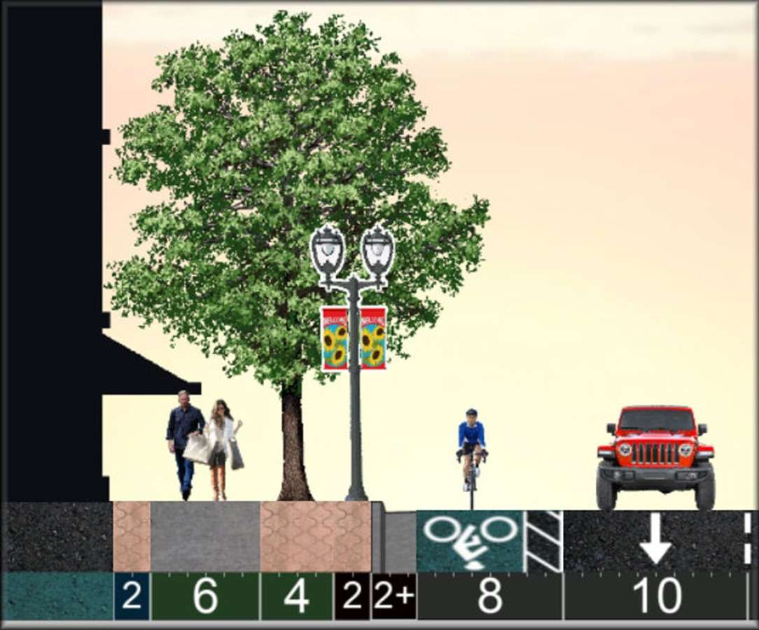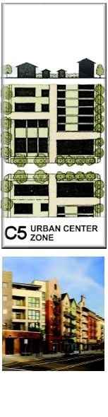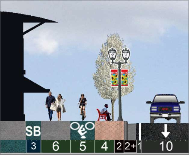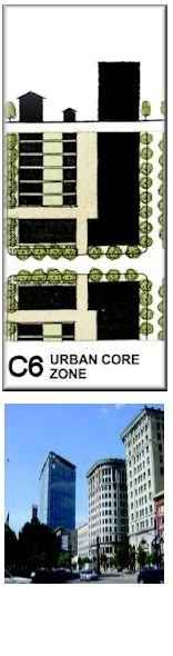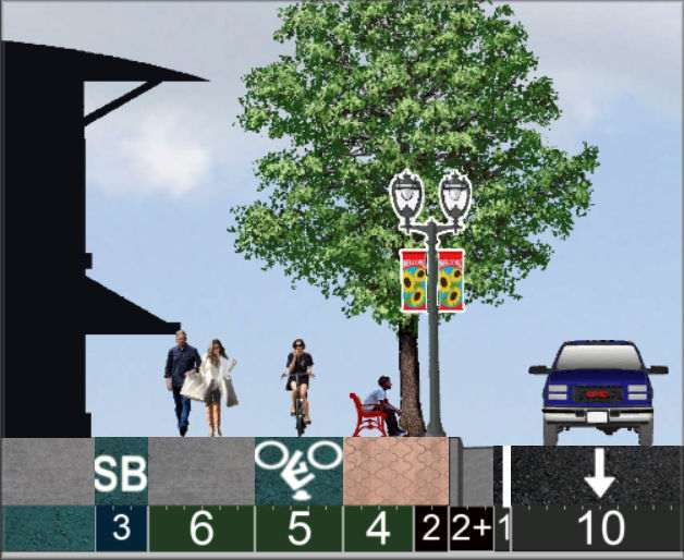 Buildings: Many within 5-ft of sidewalks. Significant residential.