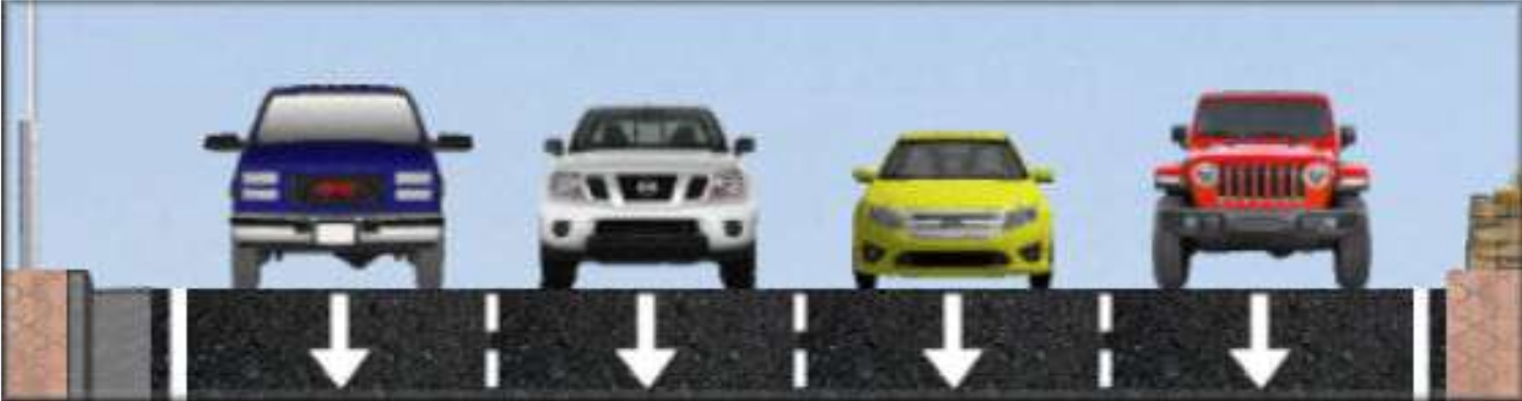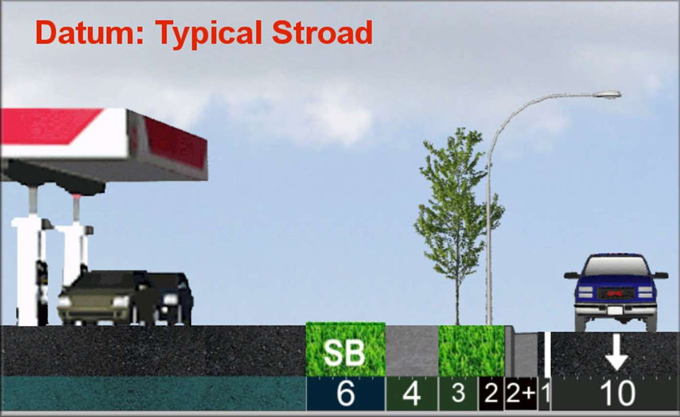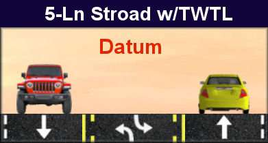 Stroad Datum: Wide shoulders with few if any parked cars. If you show a parked car, StreetPlan interprets this as “significant demand for parking” (probably greater than 50%). If parking is allowed, but little demand, better to show empty.